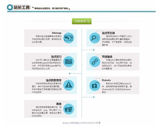 站長可以通過工具區(qū)提供的死鏈推送、站點(diǎn)索引量查詢、站點(diǎn)抓取報(bào)錯(cuò)查詢、robots工具、站點(diǎn)壓力反饋和網(wǎng)站安全監(jiān)測等功能,減輕網(wǎng)站服務(wù)器壓力,提升網(wǎng)頁抓取效率和質(zhì)量,減少網(wǎng)站安全隱患,從而實(shí)現(xiàn)網(wǎng)站的精細(xì)化運(yùn)營。資料區(qū)提供了搜索優(yōu)化案例、工具使用說明、網(wǎng)站運(yùn)營經(jīng)驗(yàn)文檔,幫助站長汲取網(wǎng)站運(yùn)營經(jīng)驗(yàn)、夯實(shí)理論基礎(chǔ);站長社區(qū)的則是站長間溝通和分享的平臺(tái),既會(huì)定期組織交流活動(dòng)和分享討論,,有利于站長們?nèi)¢L補(bǔ)短提升網(wǎng)站運(yùn)作技巧,解決站長面臨的典型問題。
