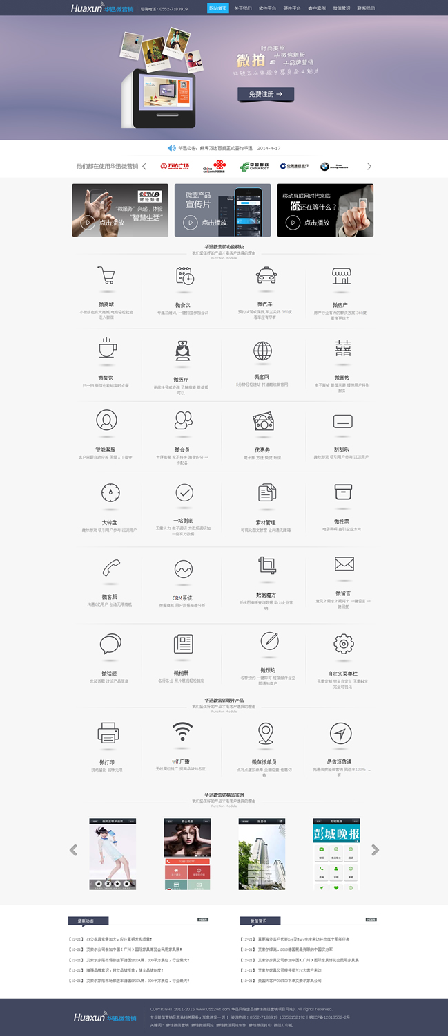 華迅網(wǎng)絡(luò)是打造一個(gè)專門針對(duì)微信公眾賬號(hào)提供營銷推廣服務(wù)的第三方平臺(tái)。主要功能是針對(duì)微信商家公眾號(hào)提供與眾不同的、有針對(duì)性的營銷推廣服務(wù)。通過華訊微網(wǎng)站平臺(tái),用戶可以輕松管理自己的微信各類信息,對(duì)微信公眾賬號(hào)進(jìn)行維護(hù)、開展智能機(jī)器人、在線發(fā)優(yōu)惠劵、抽獎(jiǎng)、刮獎(jiǎng)、派發(fā)會(huì)員卡、打造微官網(wǎng)、開啟微團(tuán)購等多種活動(dòng),對(duì)微信營銷實(shí)現(xiàn)有效監(jiān)控,極大擴(kuò)展?jié)撛诳蛻羧汉蛯?shí)現(xiàn)企業(yè)的運(yùn)營目標(biāo)。華迅微網(wǎng)站平臺(tái)很好的彌補(bǔ)了微信公眾平臺(tái)本身功能不足、針對(duì)性不強(qiáng)、交互不便利的問題,為商家公眾賬號(hào)提供更為貼心的、且是核心需求的功能和服務(wù)。在線優(yōu)惠劵、轉(zhuǎn)盤抽獎(jiǎng)、微信會(huì)員卡等推廣服務(wù)更是讓微信成為商家推廣的利器。智能客服的可調(diào)教功能讓用戶真正從微信繁瑣的日?头ぷ髦薪饷摮鰜,真正成為商家便利的新營銷渠道。